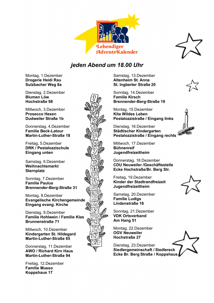 Der OGV-Neuweiler nimmt dieses Jahr erstmalig am Lebendigen Adventskalender teil. Wir unterstützen die Aktion sehr gerne da es eine schöne Tradition in Neuweiler ist. Wir sind am 18.12.2025 mit unserem Türchen dran. Es findet in der Hochstraße 27 um 18:00 Uhr statt.