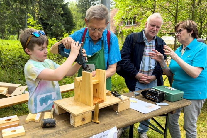 Nistkastenbau vor Ort in der Waldwerkstatt Kinder legten begeistert mit Hand an Dass der Obst- und Gartenbauverein Neuweiler schon seit nunmehr drei Jahren erfolgreich Nistkästen anbietet und sie zum Selbstkostenpreis von 8 € an Vogelfreunde weitergibt, hat sich schon über die Grenzen von Neuweiler hinaus bereits herumgesprochen. Denn wie sonst hätte Vorstandsmitglied Thomas Gutensohn 1600 (i W. eintausendsechshundert!) zusammengebaut und an den Vogel bzw. an den Vogelfreund gebracht. In der Waldwerkstatt am 1. Mai am IPA-Heim war er zugegen und zeigte vielen wie es geht. Dabei bezog er auch Kinder mit ein und forderte sie auf, mit Hand anzulegen, wovon viele begeistert Gebrauch machten, während seine Frau Gertrud Interessierten die Vorgehensweise erklärte.